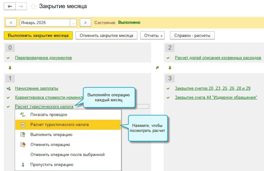 Полный интерфейс: меню «Операции - Закрытие периода - Закрытие месяца - Расчет туристического налога».