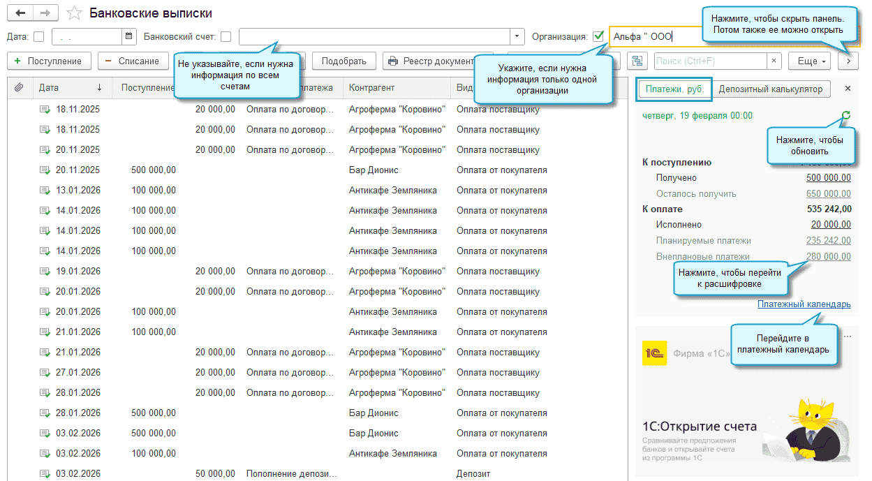 В программе «1С:Бухгалте­рия 8» начиная с релиза 3.0.193 добавлена возможность в течение дня смотреть актуальную информацию о планируемых и фактических платежах за день на текущий момент. Для этого в журнал банковских выписок и платежных поручений добавлена панель справа. Если подключен сервис «1С:ДиректБанк» с банками, которые поддерживают оформление заявок на депозит, то доступен также депозитный калькулятор для быстрого расчета условий депозита.