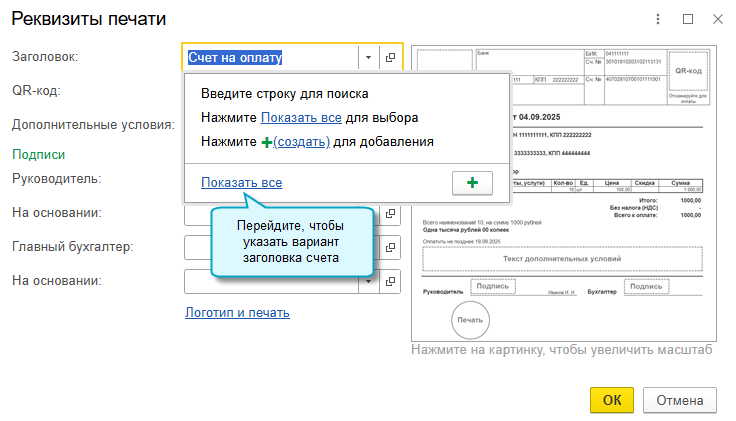 В программе «1С:Бухгалтерия 8» начиная с релиза 3.0.185 добавлена возможность указать, с каким заголовком распечатать счет покупателю: счет на оплату, счет-оферта, счет-договор или другой вариант. Выбранный заголовок заполняется потом в УПД в основании передачи, если в нем требуется указать счет.