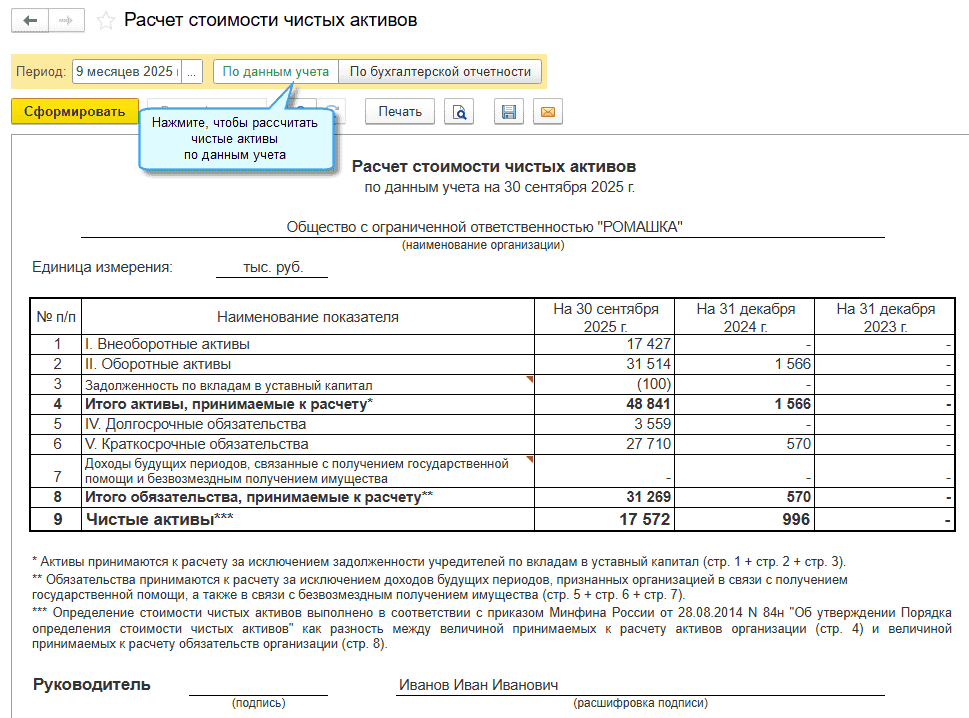 Расчет стоимости чистых активов в «1С:Бухгалтерия»