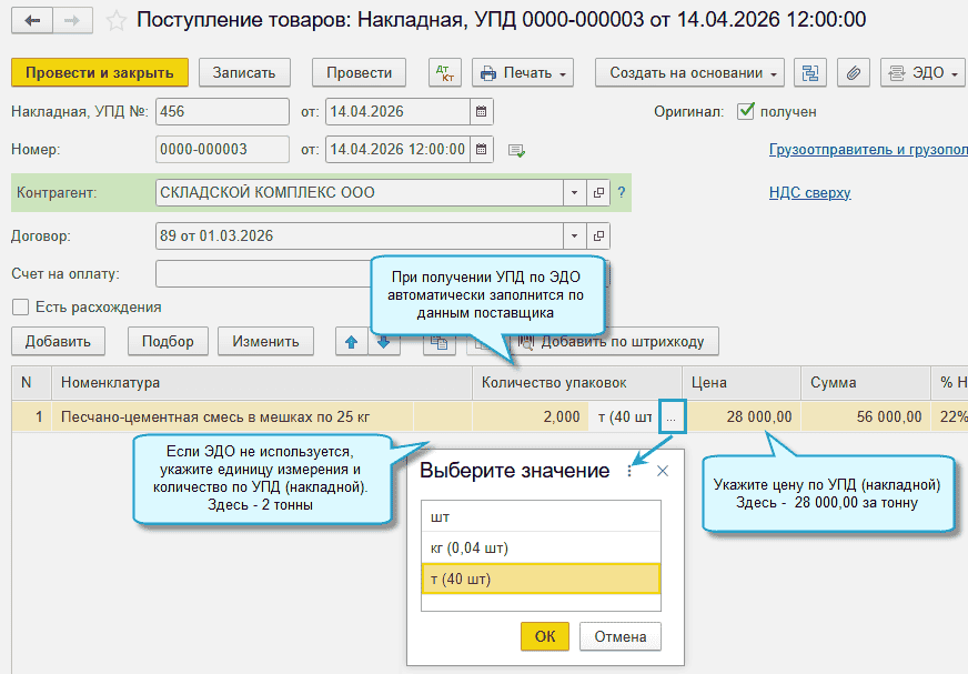 При получении от поставщика УПД по ЭДО автоматически будет заполняться используемая им единица измерения, если она указана в карточке товара как вариант упаковки.