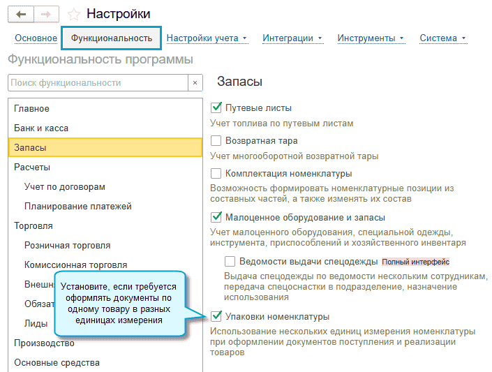 Простой интерфейс: меню «Настройки - Функциональность – Запасы».