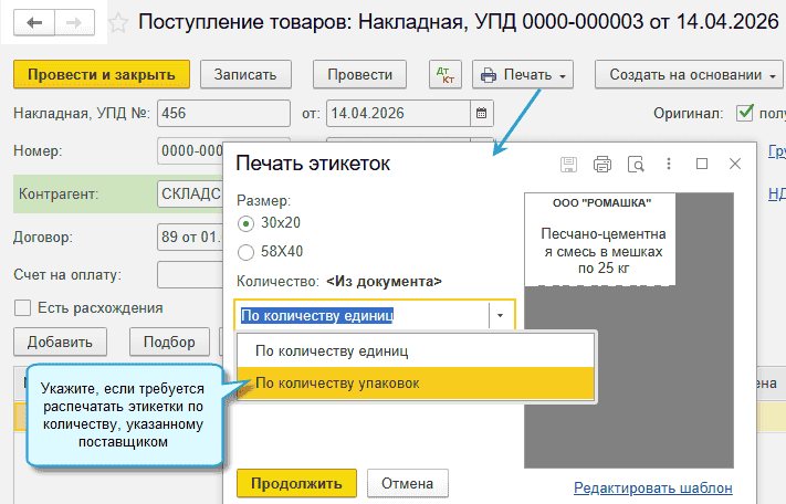 Для этого добавлена возможность указывать количество упаковок в документах поступления и реализации. Учитывается товар по-прежнему в одной единице измерения. Количество упаковок пересчитывается по специальному коэффициенту в количество в единице измерения остатков товара.