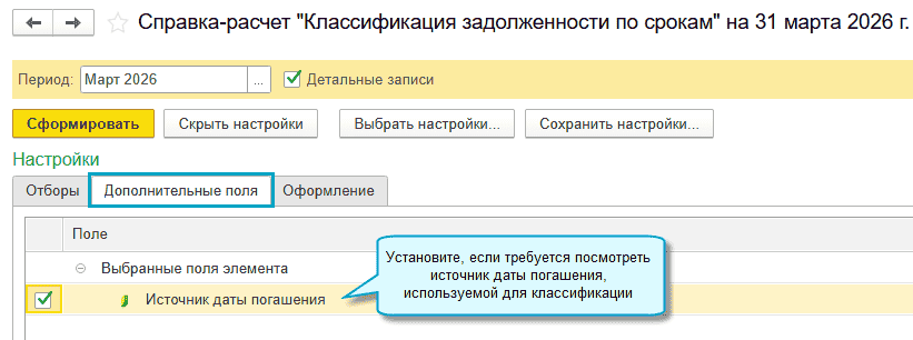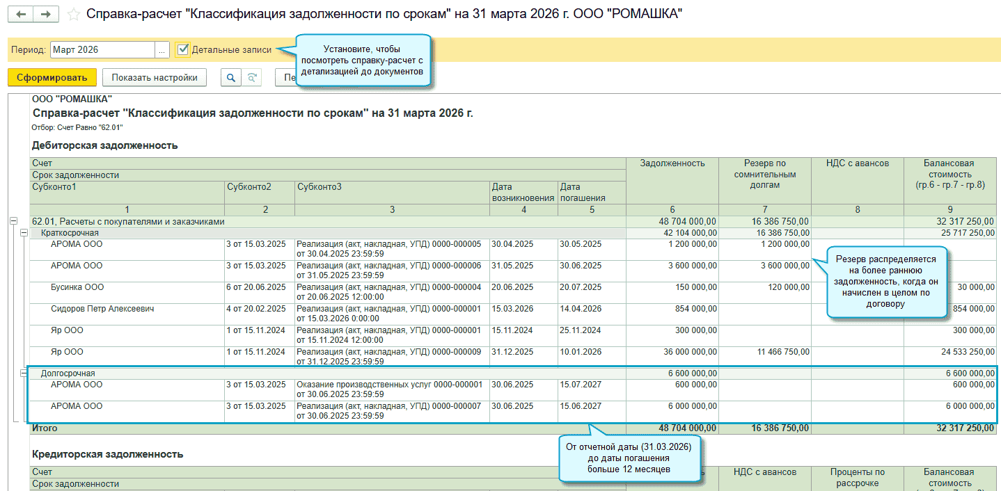 Классификация задолженности по срокам осуществляется на основании дат погашения, указанных в документе Акт инвентаризации расчетов.