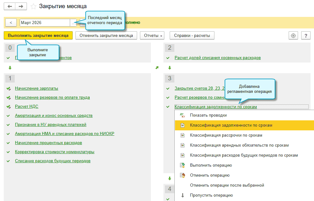 Полный интерфейс: меню «Операции - Закрытие периода - Закрытие месяца - Классификация задолженности по срокам».