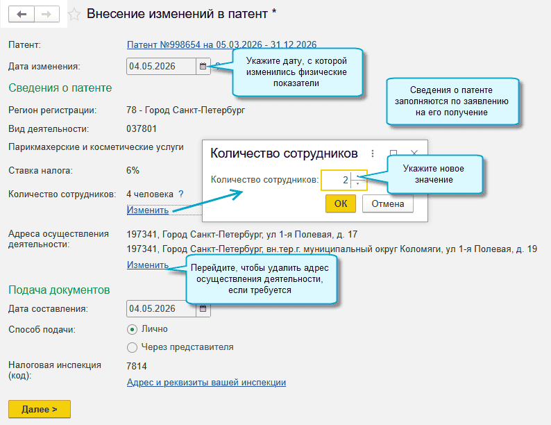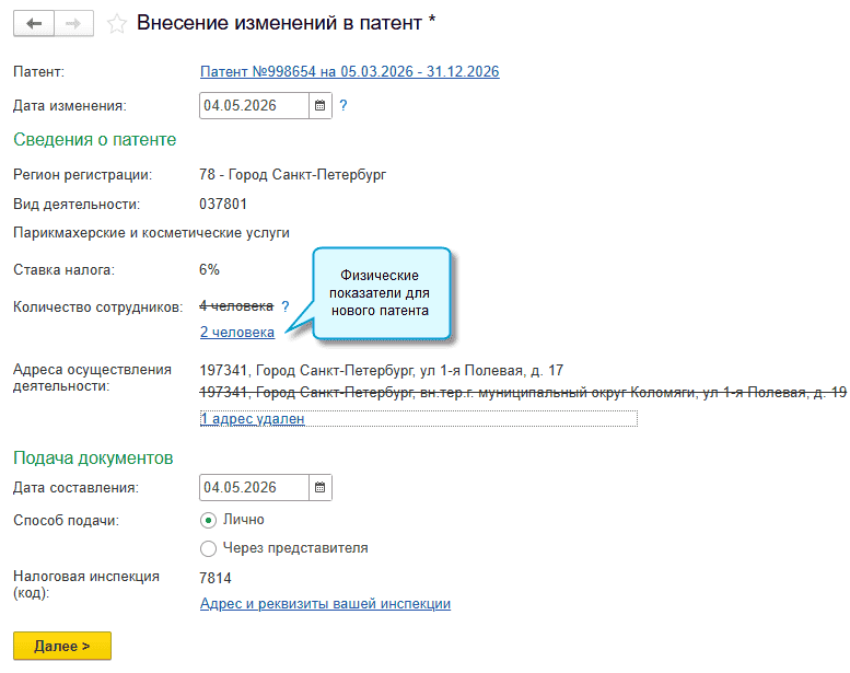 С 2026 года ИП может подать заявление на получение патента взамен ранее выданного, если уменьшается количество объектов, используемых в деятельности по патенту (физических показателей), указанных при его получении. Например, когда стоимость патента зависит от количества сотрудников, а количество сотрудников уменьшается. Тогда по заявлению прекращает действовать первый патент, налог по нему пересчитывается, и выдается новый патент с даты уменьшения количества сотрудников (Федеральный закон от 28.11.2025 № 425-ФЗ).