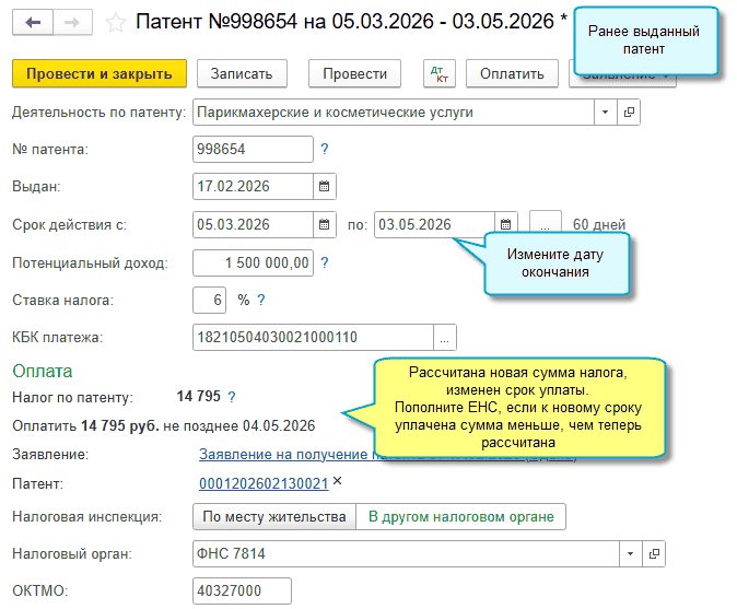 Если подключен сервис «1С-Отчетность», то после получения из ИФНС нового патента автоматически будут внесены изменения в ранее выданный патент и будет добавлен новый патент.