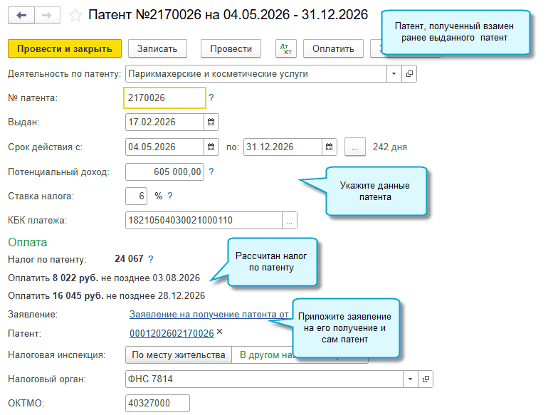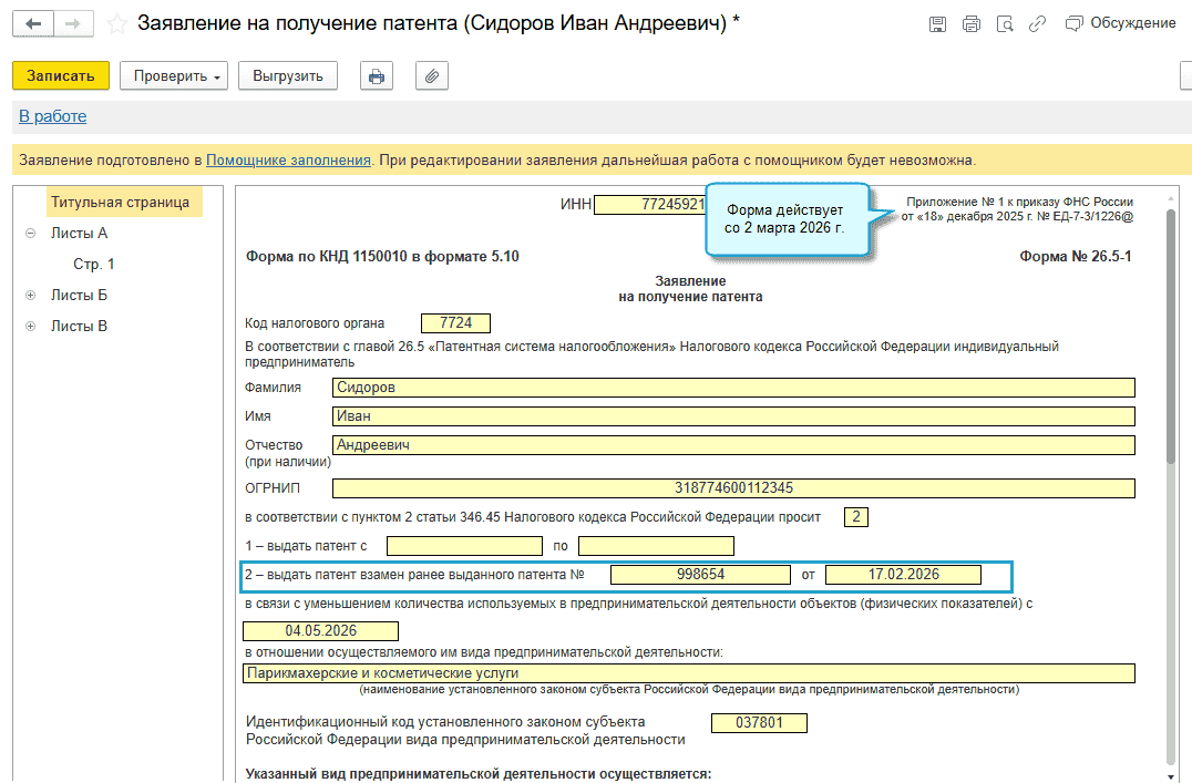 В программе «1С:Бухгалте­рия 8» начиная с релиза 3.0.193 поддержано заполнение заявления на получение патента, действующего с 02.03.2026 (Приказ ФНС от 18.12.2025 № ЕД-7-3/1226@).