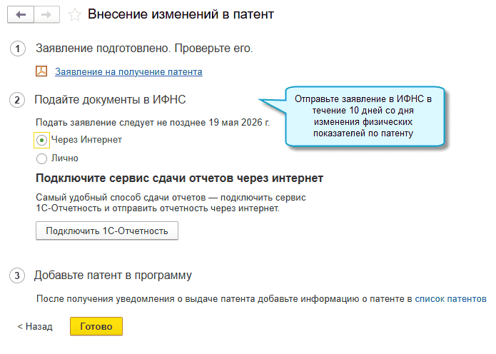 Заявление на получение патента в «1С:Бухгалте­рия 8»