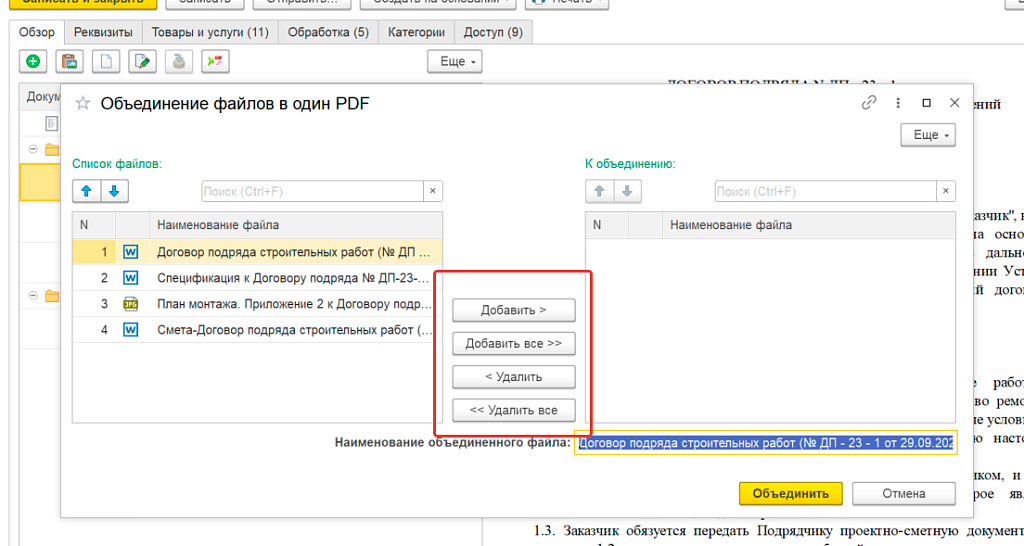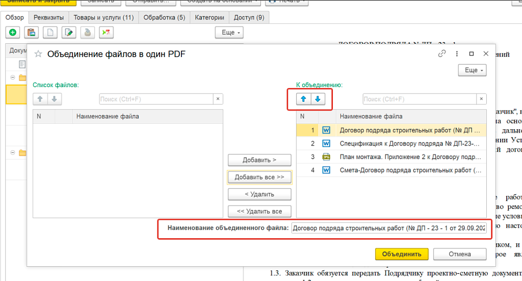 После нажатия кнопки «Объединить» – единый pdf-файл прикрепляется к документу и доступен для любых действий